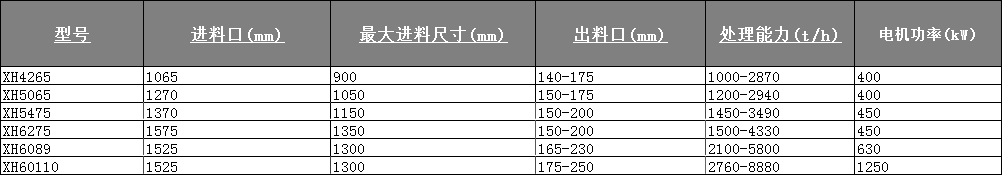 XH 旋回式破碎機擁有精細的破碎腔設計,確 保更強的生產能力、更大的進料粒度及更長的襯板 壽命;大傾角和長破碎面設計,配合優化設計的沖 程和轉速,使破碎機具有超強的破碎能力,適用于 各種粗碎破碎作業需求;通過簡單更換偏心套,就 可以改變破碎機的處理能力,以滿足不同的破碎工 藝需求。
