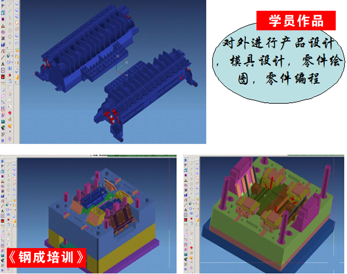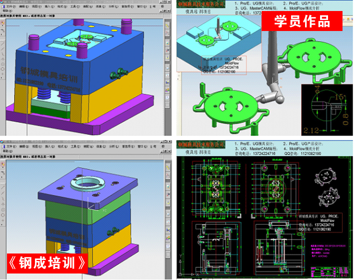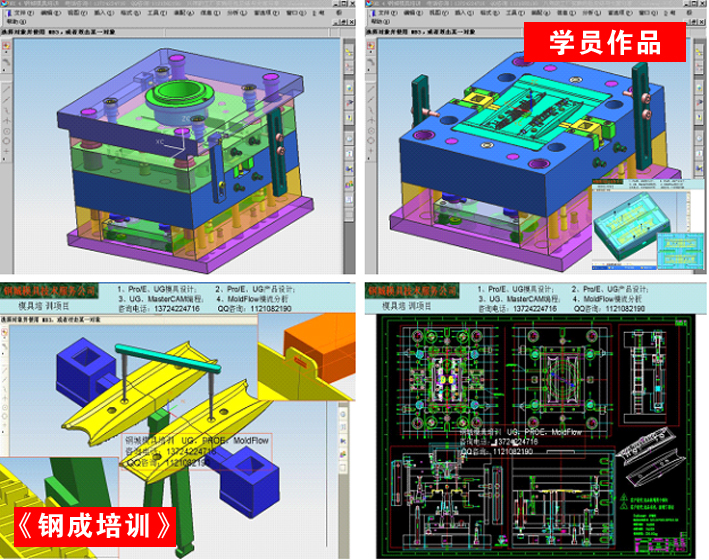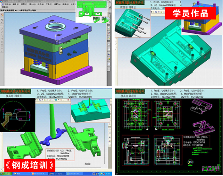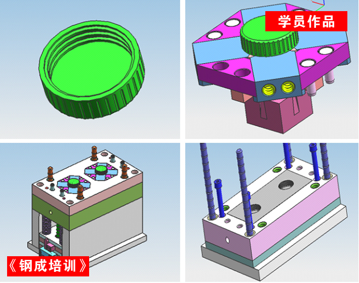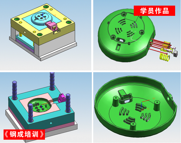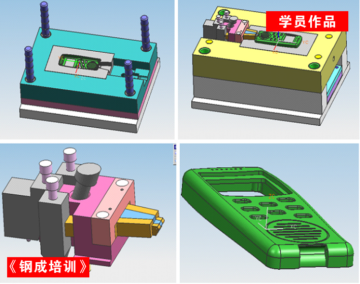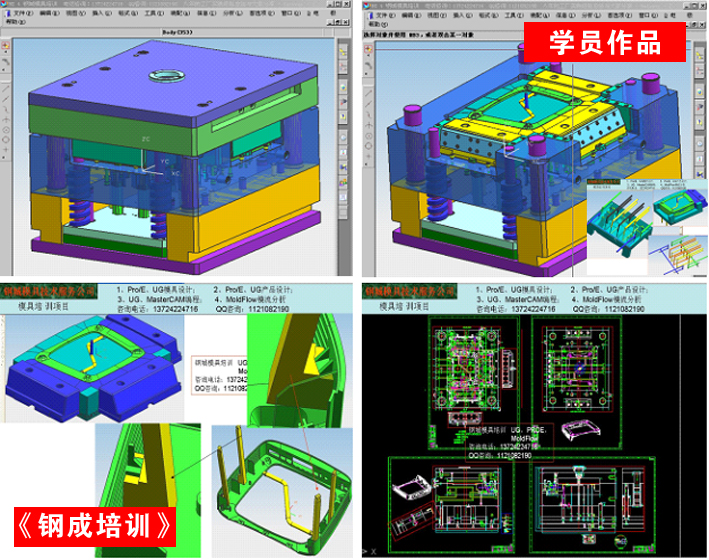 (其中包括,熱流道模具,內(nèi)外螺紋模具,圓弧抽芯,二資頂出,雙色模具,行位中行位,行位中頂錢,行位中斜頂,內(nèi)行位,前模斜頂,后模斜頂,各種模具結(jié)構(gòu)講與相應(yīng)大量練習(xí),使學(xué)員做到舉一反三,靈活運(yùn)用各種模具結(jié)構(gòu)。)